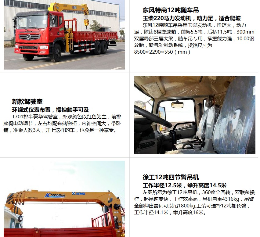 隨底盤選裝駕駛室.選裝箱板結構,選裝上/中座椅操作,可選裝直臂式或折臂式吊機,直臂式吊機:型號/吊機質量(kg)/最大起升載荷(kg)/載質量分別為:(QYS-10III,SQS-10III,URV1004,SPS25000,KS2305,nicoleV1004)/4000/6000/8520(2人),8455(3人);(QYS-12IV,SQS-12IV,URV1200,SPS30000,nicoleV1200)/4500/7000/9900(2人),9835(3人);.折臂吊機的分別為:(SQ10Z,QYS-10Z)/4000/6000/8520(2人),8455(3人);SQZ-12III/4500/7000/9900(2人),9835(3人);外形尺寸/軸距/前懸/后懸對應關系分別為:10050/4350 1300/1250/ 3150(1450/2950),10550/4750 1300/1250/3250(1450/3050),11350/5350 1350/1250/3400(1450/3200),11930/5850 1350/1250/3480,12000/5850 1350/1250/3350;發動機對應油耗值為:YC6A240-50/35.3(L/100km),ISD245 50/35.3(L/100km),ISD210 50/35.3(L/100km),YC6A270-50/35.3(L/100km);側防護:材質Q235,螺栓連接.后下防護:材質Q235,焊接連接,斷面尺寸120?0mm,離地高度520mm;該車應安裝具有衛星定位功能的行駛記錄儀.ABS型號為:3631010-C2000,生產廠家為:東科克諾爾商用車制動系統(十堰)有限公司.