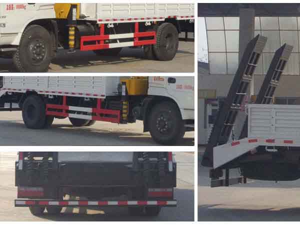 選裝駕駛室前圍面板,進氣格柵,前保險杠及前部燈具。選裝無爬梯結構時貨廂長(mm)為5800。吊機型號/吊機重量(kg)/最大起升載荷(kg)/整備質量(kg)/載質量(kg)/分別為: 1,(SQ8SA3)/3000/8000/10090/5715;2,(SQ7SA3, SQ7SA2): 2070/7000/9160/6645。整車長/前懸/后懸/軸距(mm)對應關系為:9000/1250/2650/5100, 9000/1430/2470/5100。該車僅選用5100mm軸距。防護材料:Q235A碳鋼,連接方式:左右側面與箱體底面采用焊接連接, 后下防護與平板采用焊接連接,斷面尺寸(mm):110?0?,后部防護離地高度(mm):405。該車選用發動機型號: ISB170 40,ISB190 40,YC6J180-46對應的油耗值分別為(L/100km): 28.0,28.0,28.0。安裝帶有衛星定位功能的行駛記錄儀。 ABS型號為3631010-C2000,生產廠家為東風電子科技股份有限公司汽車制動系統公司。
